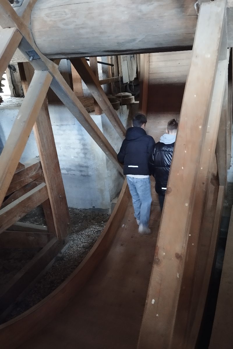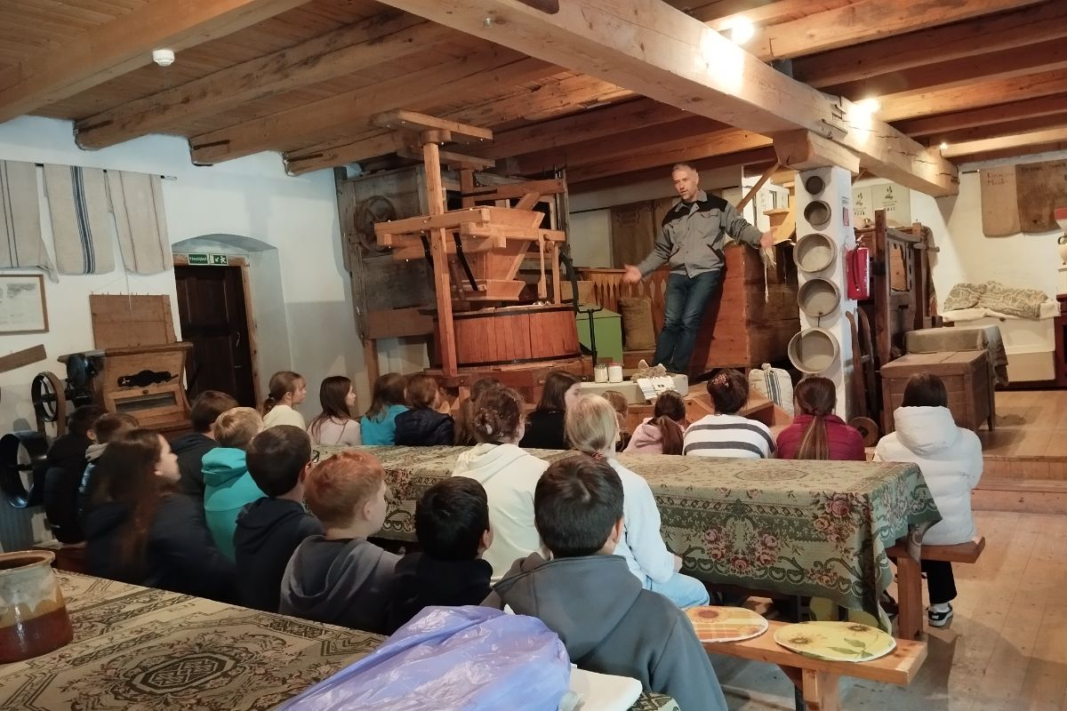 A gólyák látványetetése volt a csúcspont, hiszen két sérült gólya is ott él a múzeum udvarán! A busóudvar is tetszett a gyerekeknek, igyekeztek jó nagy zajt csapni a kereplőkkel, kolompokkal. A vízimalmot megtekintettük működés közben, a taposómalmot ki is próbáltuk! Sőt, a gyerekek kisebb kézimalmokkal őröltek, az ottani csirkék nagy örömére!