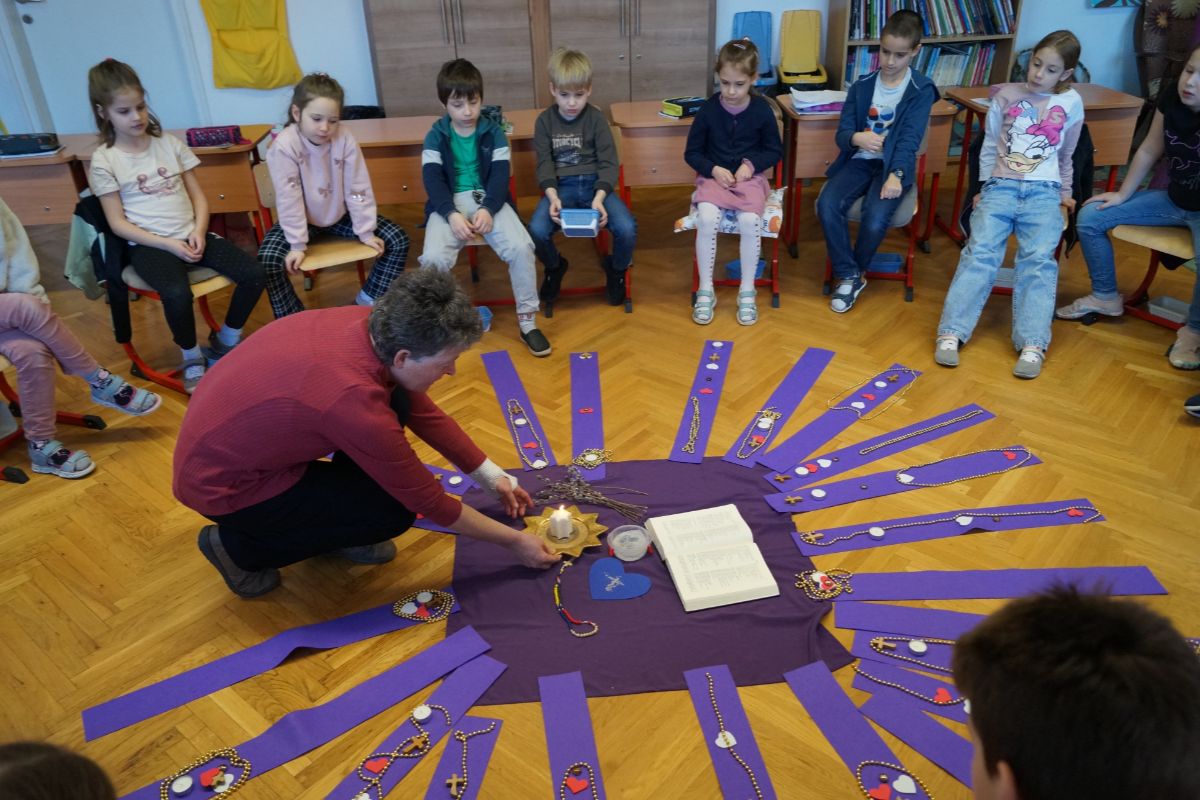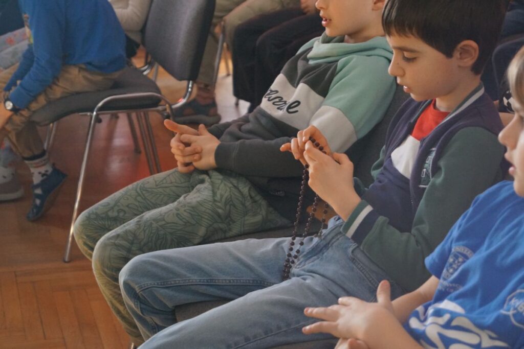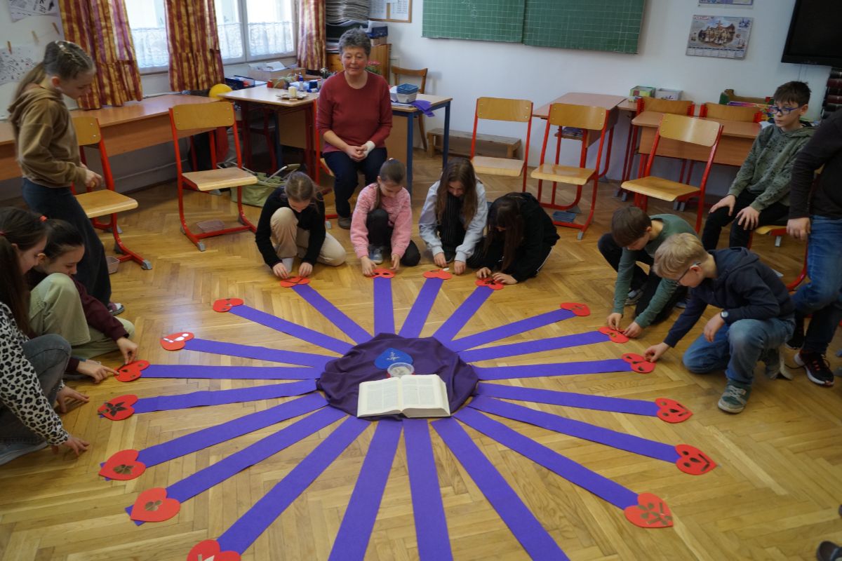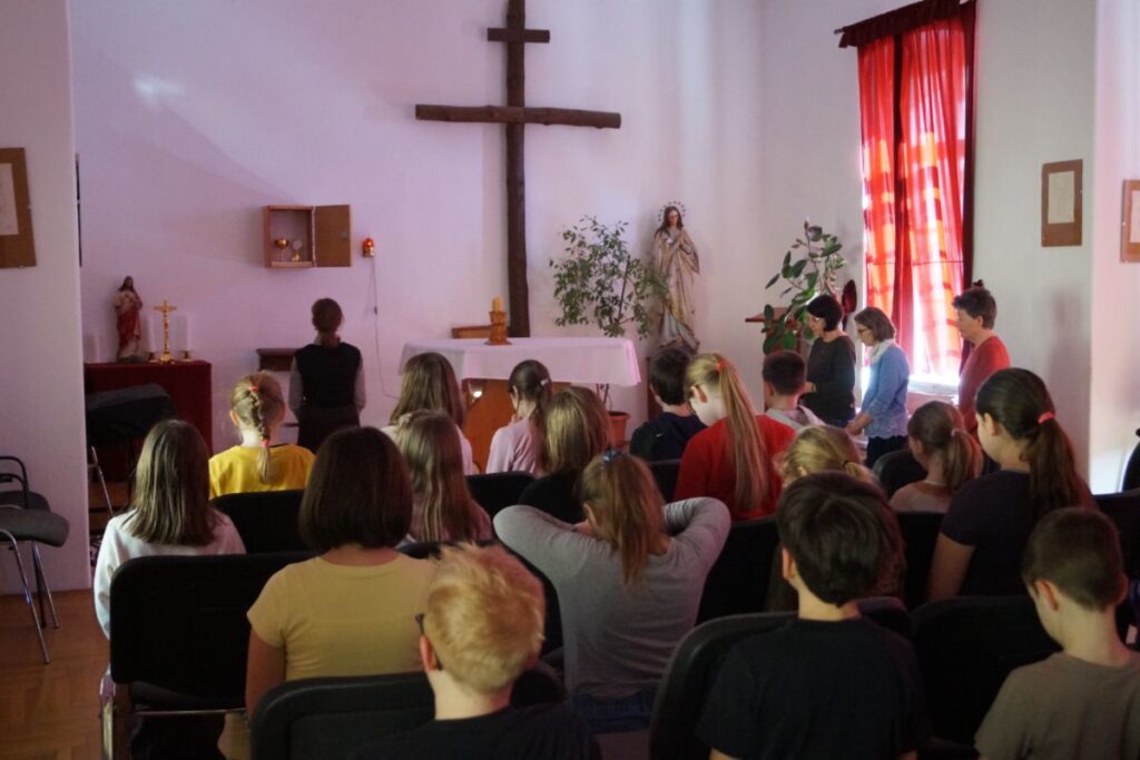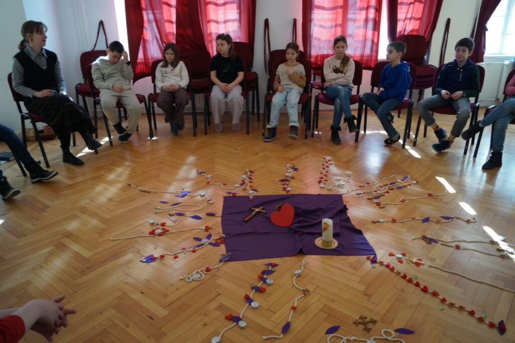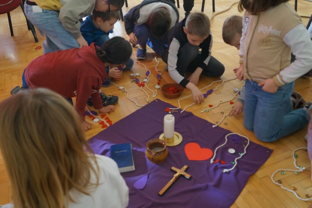 A hamvazkodás után az alsósok padlóképes foglalkozáson és rózsafüzér-imádságon vehettek részt kápolnánkban. A nagyobbakat képmeditáció és Szentségimádás segítette az elmélyülésben, míg a kisebbek az Alkotó Biblia és a kézműves foglalkozás által kerülhettek közelebb a Szentírás üzenetéhez.